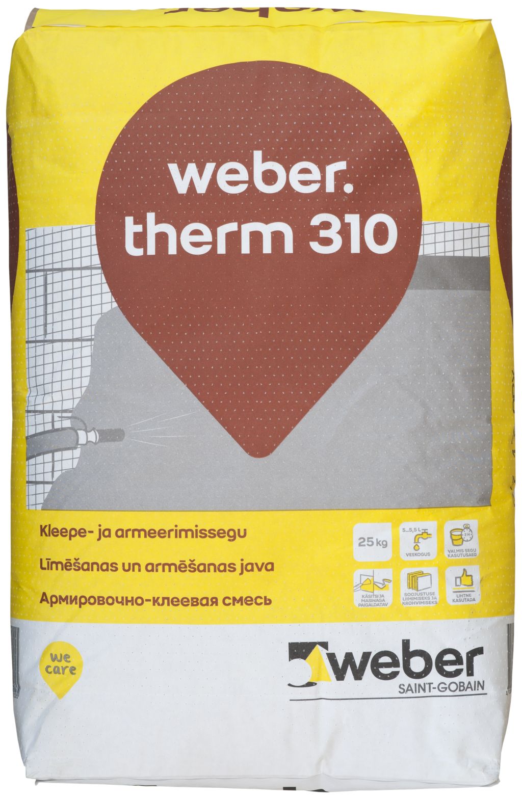 Webertherm 310 on fiiberkidudega tsemendil ja polümeersetel lisanditel baseeruv universaalne liim- ja armeersegu, mida kasutatakse mineraalvilla liimimiseks ning nii EPS / XPS kui ka mineraalvilla armeerimiseks Weberi soojusisolatsiooni-liitsüsteemides (SILS). Toode on suure nakketugevusega ja väga elastne ning tagab SILS-i ehitamisel suure löögitugevuse. Sobib ka mineraalsete aluspindade tasandamiseks 2...10 mm kihis. Testitud külmakindlus: 100 tsüklit!