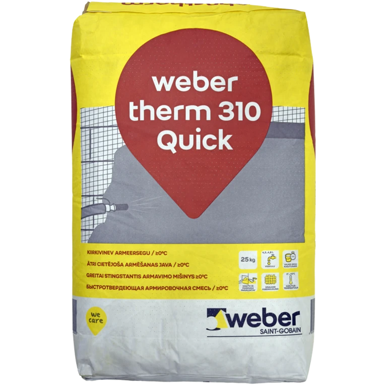 Webertherm 310 Quick on fiiberkiududega polümeermodifitseeritud kiirkivinev liim- ja armeerimissegu erinevate soojusisolatsiooni-liitsüsteemide (SILS) ehitamiseks (WeberTherm ja WeberMin SILS). Toode on nii käsitsi- kui ka pumbaga paigaldatav. Therm 310 Quick sobib ka kiviseinte tasandamiseks. Segu on mõeldud kasutamiseks jahedates ja talvistes oludes. Sobiv aluspinna ja töökeskkonna temperatuur tööde teostamise ajal ning vähemalt 6 h peale tööde lõpetamist on 0 ?C…+10 ?C. Järgneva 24 h jooksul võib temperatuur langeda kuni -5 ?C. Hiljem enam miinimumpiiri ei ole.