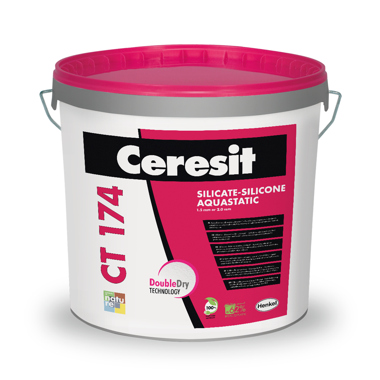 CERESIT CT 174 ühendab endas silikaat- ja silikoonkrohvi head omadused. Toode on veeauru läbilaskev, vähese imavusega ja määrdumiskindel. Soovitame kasutada CT 174 fassaadiviimistluskihina krohvitud välistes soojusisolatsioonisüsteemides CERESIT Ceretherm, mis kaetakse vahtpolüstüreen- ja mineraalvillplaatidega. Krohv on kaitstud bioloogiliste mõjurite, nt seente, hallituse ja vetikate toime eest.