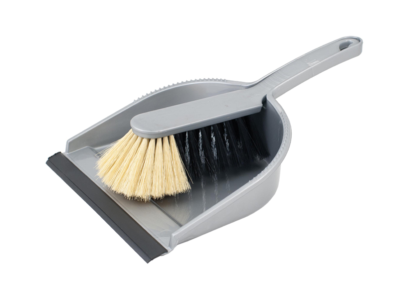 Plastharja ja kühvli komplekt. Sünteetilised harjased musta-valge värvikombinatsiooniga.