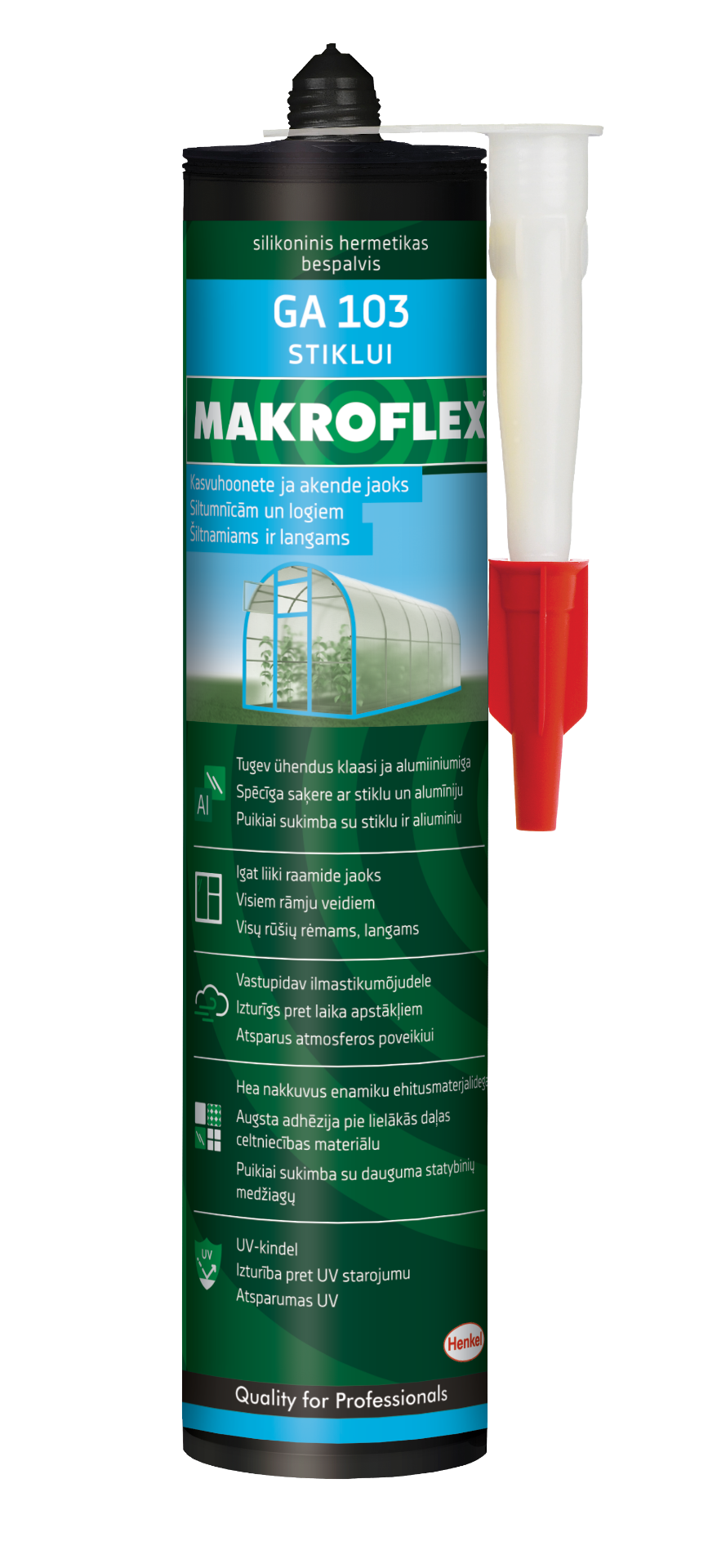 MAKROFLEX GA103 on kvaliteetne klaasimissilikoon kõikideks klaasimistöödeks. Hea nake erinevate mittepoorsete materjalidega nagu klaas, glasuurplaadid, alumiinium ja metall. Väga hea vastupidavus vananemisele, kahanemisele, pragunemisele ja värvimuutustele. Väga hea UV-kindlusega. Ei sisalda lahusteid.