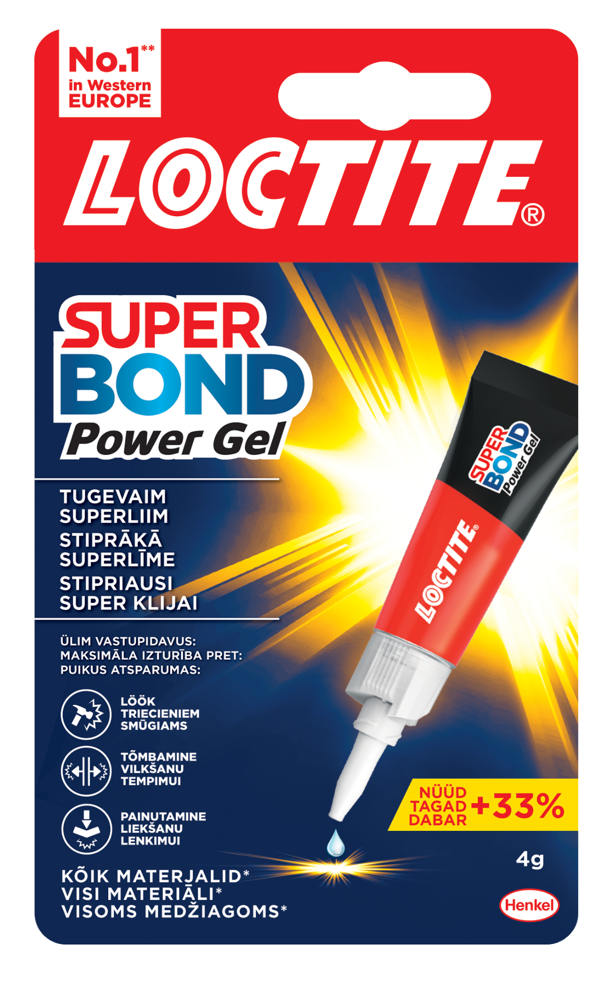 LOCTITE SuperBond Power Gel on ühekomponentne vedel geeljas kiirliim. See on mõeldud kodukasutuseks ja see tagab tugeva nakke paljude tavaliste materjalide puhul. Mittetilkuva koostise tõttu saab liimi kasutada nii vertikaalsetel kui ka pea kohal asuvatel pindadel. Liim sobib hästi selliste materjalide jaoks nagu plast*, kummi, metall, puit, keraamika, nahk, riie, papp ja paber. * välja arvatud PE, PP ja PTFE.