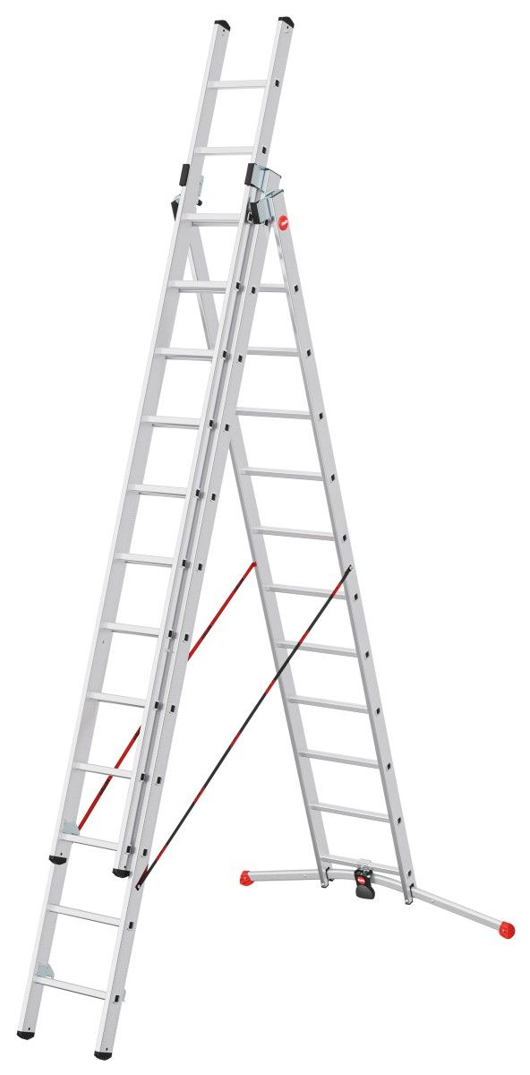 Alumiiniumist, vastupidav, kombineeritud redel "PROF" 3x12 astet. Libisemiskindlad jalad - 100% kontakt maapinnaga. Paindlik, mitmekülgne ja ohutu. Kompenseerib pinna ebatasasused kuni 15 cm, reguleeritav pedaali abil. Maksimaalne töökõrgus 900cm, kandevõime 150kg.