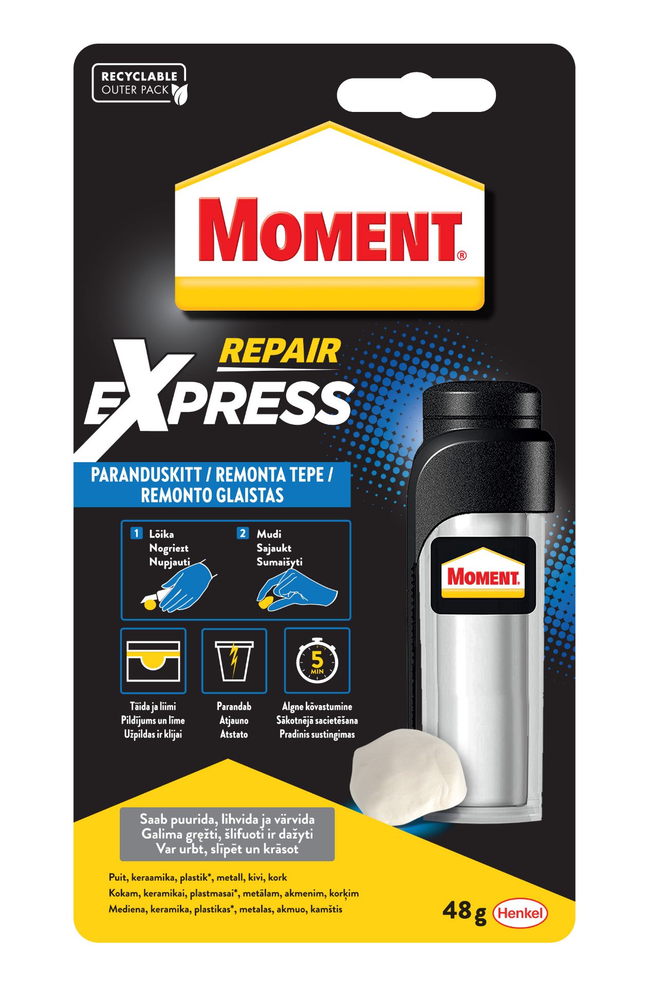 MOMENT Repair Express on kiiresti kõvenev hästi nakkuv kahekomponentne epoksümass. Täitmiseks, tihendamiseks, liimimiseks, parandamiseks ning esemete taastamiseks mõeldud liim ühendab omavahel paljusid erinevaid materjale – näiteks puitu, kõva plasti (välja arvatud PP, PE, Teflon® jms), keraamikat, kivi ja metalli. Sobib veega kokku puutuvate pindade tihendamiseks ja liimimiseks eeldusel, et liimitav pind on liimimise ajal kuiv. Ülevärvitav, lihvitav ja puuritav. Sobib nii sise- kui ka välitöödeks. Eriti sobilik sellisteks projektideks nagu näiteks tüübli aukude täitmine, rikutud mööblidetailide taastamine, surveta veelekete peatamiseks jpm.
