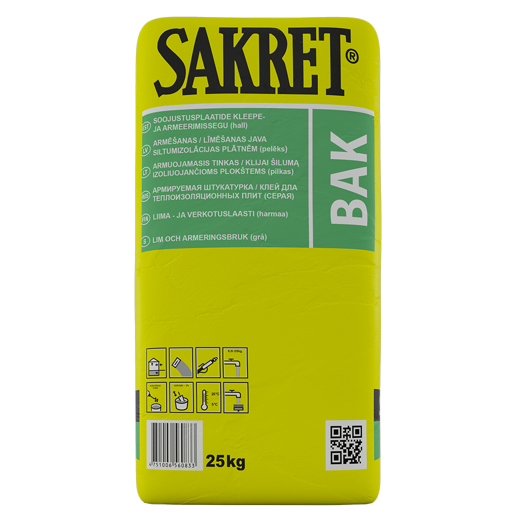 • Vahtpolüstüreenist ja mineraalvillast soojusisolatsiooniplaatide armeerimiseks ja kleepimiseks • Mineraalsete pindade õhukesekihiliseks tasandamiseks • Välis- ja sisetöödeks • Vee- ja külmakindel • Tsemendi baasil, sisaldab armeerimiskiude • Nakke- ja elastsusomadusi parandavate lisanditega • Kõrge veeauru läbilaskvusega • Käsitsi ja pumbaga pealekantav • Halli värvusega • Soojusisolatsioon-liitsüsteemide ETICS SAKRET EPS (ETA-10/0064) ja ETICS SAKRET MW (ETA-10/0185) komponent