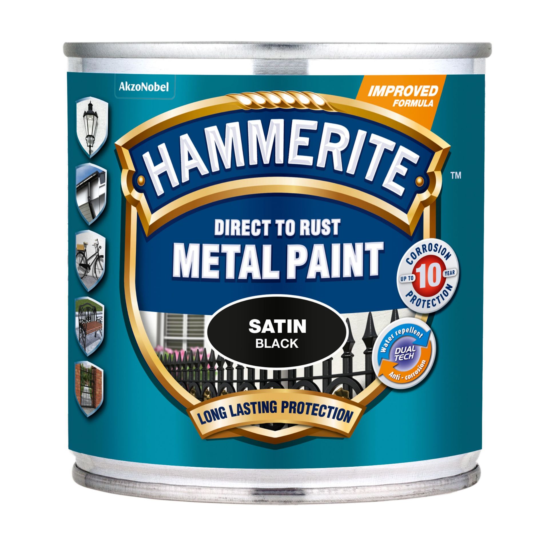 Hammerite Satin Finish on väga hea korrosioonikindlusega ühekomponentne poolmatt metallivärv, mida võib kanda otse roostes pinnale. Värvi on mugav kasutada, see ei valgu värvides ning moodustab poolmati pinnale sileda ja tugeva ilmastikukindla kaitsekihi. Unikaalne Dualtech tehnoloogia muudab värvitud pinna vett ja mustust hülgavaks ning takistab rooste teket pinnal. Nõuetekohasel viimistlemisel tagab värv pinnale pikaajalise roostekaitse kuni 8 aastat. Värvitud pind talub +80°C kuumust ning on vastupidav kodukeemia ja rasva mõjule, samuti niiskuse- ja temperatuurikõikumistele. Toode on saadaval musta valmistoonina. Toode on mõeldud kasutamiseks välis- ja sisetööl metallpindade viimistlemiseks, nt kandekonstruktsioonid, postid, piirded, uksed, väravad, vihmaveetorud ja -rennid, õuevalgustid, aiamööbel, parkide ja mänguplatside metalltarvikud, aiakärud, mahutid.