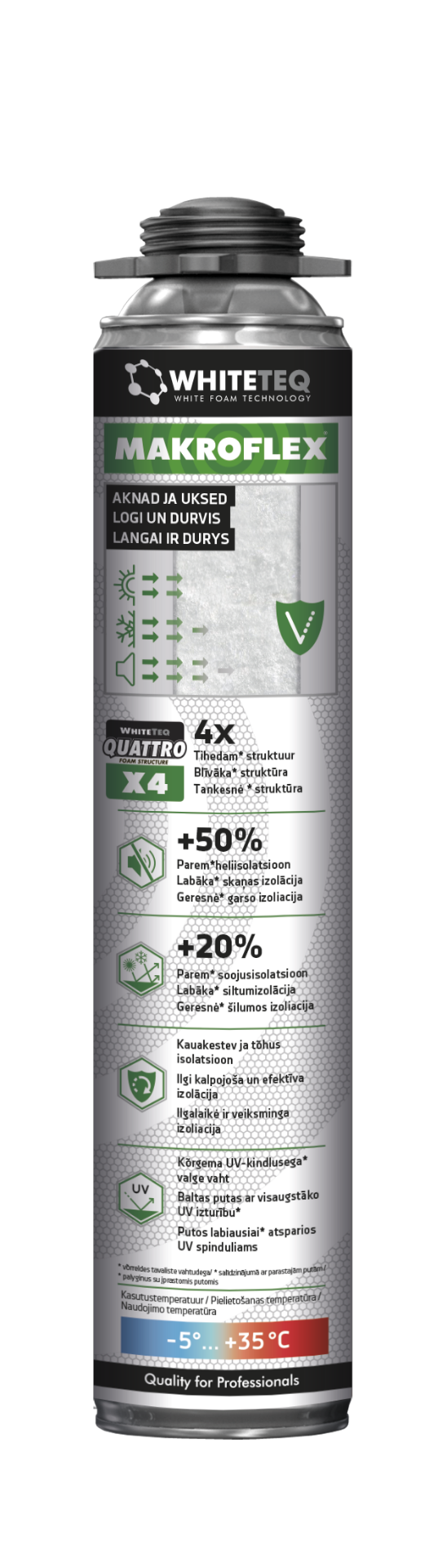 MAKROFLEX WhiteTeq PRO püstolivaht on puhastatud ja kontsentreeritud tooraine põhine ühekomponentne valge polüuretaanvaht. WhiteTeq tehnoloogia tagab mugavad tahkumisparameetrid ning annab vahule iseloomuliku valge värvuse, ülipeene kärgstruktuuri ja parema UV-kindluse. Tahkunud vahu soojusjuhtivus on kuni 0,030 W/mK ja helisummutusomadused küündivad 63 detsibellini.
