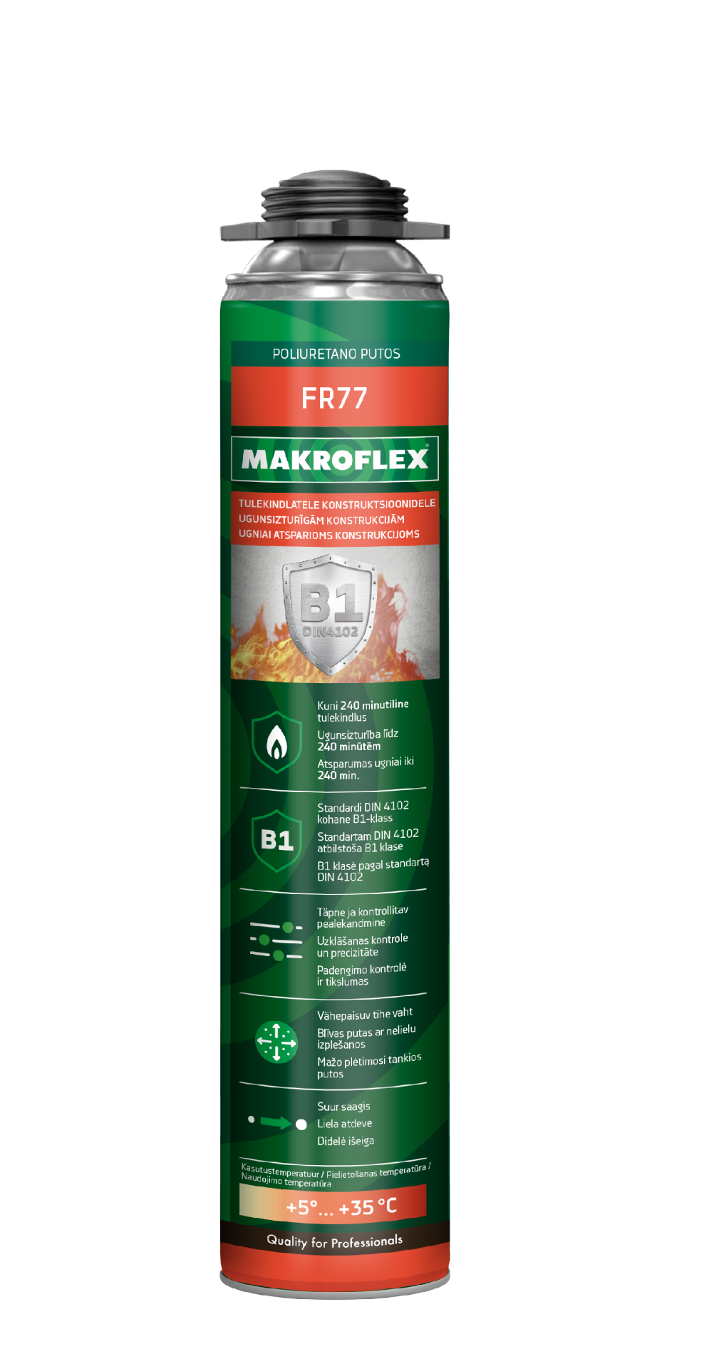 MAKROFLEX FR77 on spetsiaalne tuld tõkestavate omadustega vaht kasutamiseks ehitiste ja konstruktsioonide lineaarvuukides, kus kehtivad erinõuded tulekindluse kohta. Toodet on katsetatud tuldtõkestavate konstruktsioonide lineaarsetes vuukides kooskõlas alljärgnevate standarditega: katsemeetod EN 1366-4:2006 kohaselt. Klassifikatsioon EN13501-2:2009 järgi.