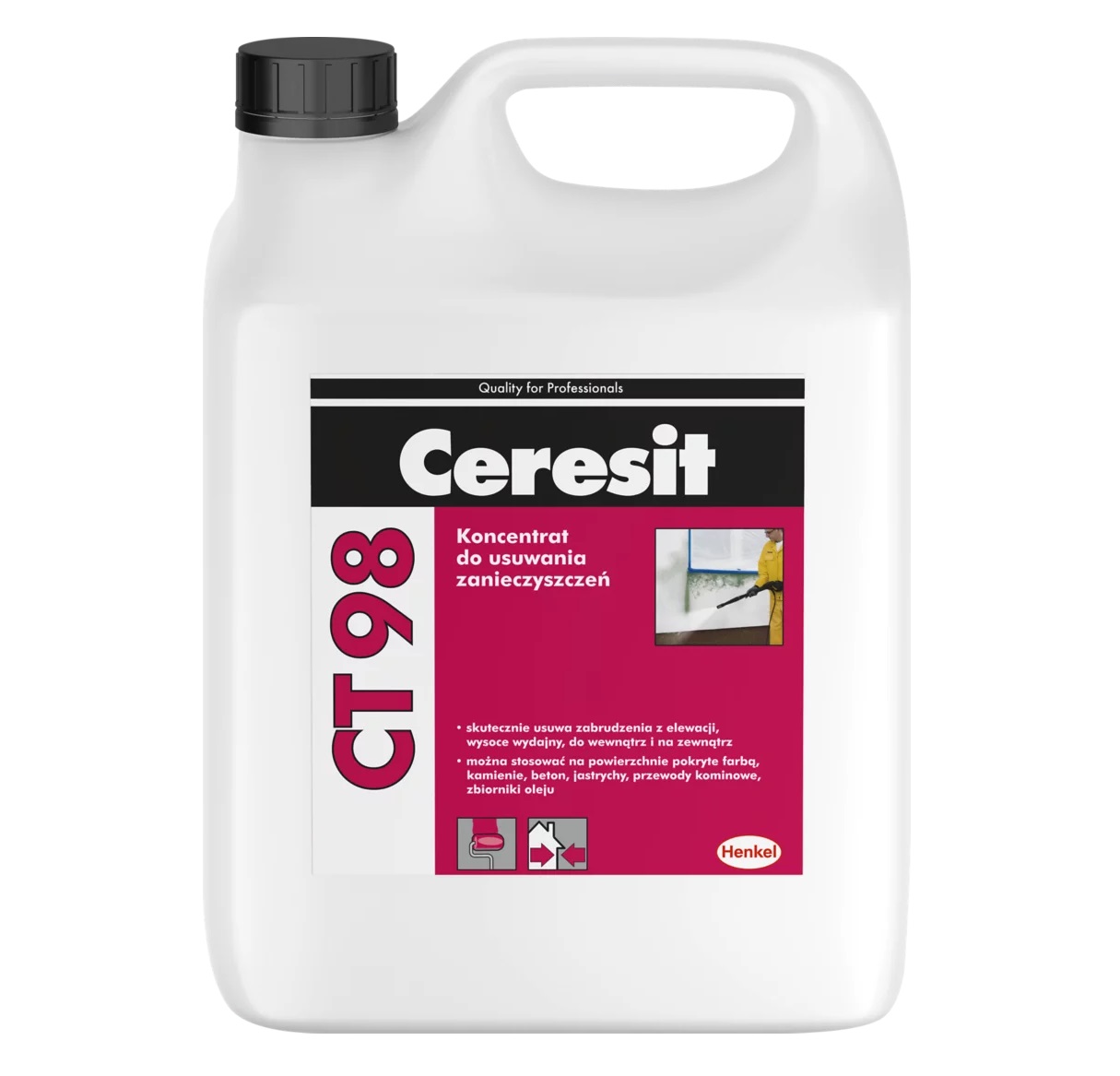 CERESIT CT 98 puhastusvahendi kontsentraati kasutatakse SILS-tehnoloogias tehtud ja õhukesekihilise mineraal-, akrüül-, silikaat-, silikoon-, silikaat-silikoonkrohviga viimistletud; tavapärases tehnoloogias tehtud ja tsementlubikrohviga viimistletud; looduslikust ja tehiskivist tehtud või keraamilise kattega viimistletud ning klaasist ja alumiiniumist tehtud tugevasti määrdunud hoonefassaadide puhastamiseks rasvast ja muust mustusest. Toode on süsteemi CERESIT Ceretherm Repair koostisosa.