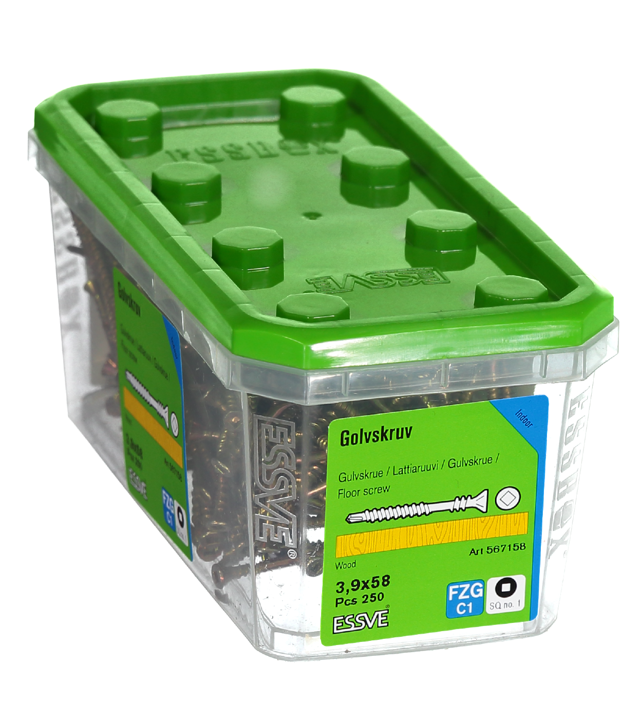 ESSVE põrandakruvi on mõeldud massiivsete puitpõrandate, põranda- ja puitliistude jms montaažiks sisetingimustes puidust aluspinnale. Kõvema puitpõranda (nt tamm) paigaldamisel tuleb ette puurida.