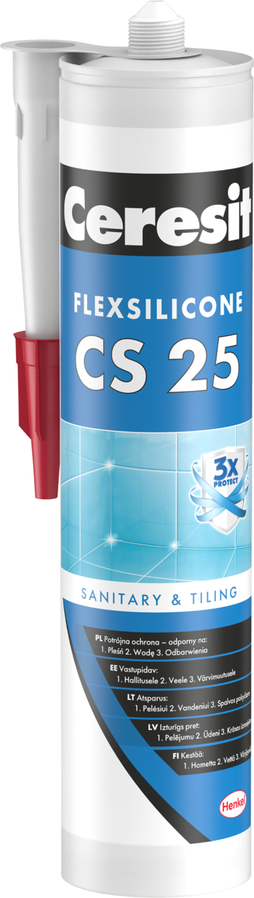 CERESIT CS 25 sanitaarsilikooni kasutatakse keraamiliste plaatide vuugivahede täitmiseks ruumide nurkades ning seinte ja põranda ühenduskohtades. CS 25 on ülimalt veekindel ning on saadaval 40 värvitoonis, mis vastavad CERESIT vuugitäidete toonidele. CS 25 on vastupidav ilmastikutingimustele ja UV-kiirgusele ning tagab suurepärase nakke erinevat tüüpi materjalidega. CS 25 koostis sisaldab toimeaineid, mis takistavad seente kasvu ja hallituse arengut, vähendades eoste tekkimise võimalust ning levikut ja pärssides nende kasvu.