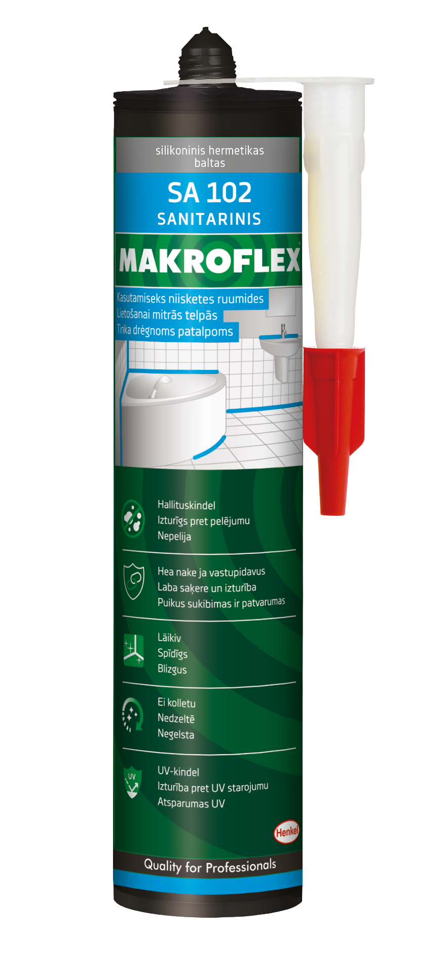 MAKROFLEX SA102 sanitaarsilikoon on parimate omadustega silikoon niisketesse ruumidesse. Sisaldab seenetõrjevahendeid ehk antiseptilisi hallitusvastaseid aineid, mistõttu on niisketes ruumides eriti vastupidav. Sobib sanitaartöödeks nii sise- kui ka välistingimustes. Õhu- ja ultraviolettkiirguse kindel.