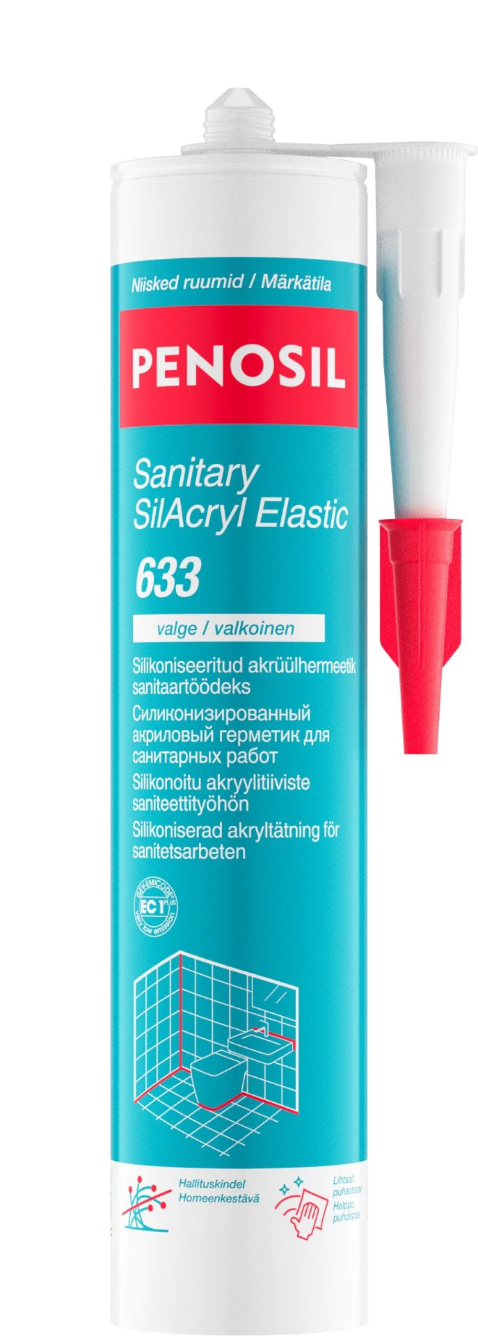PENOSIL Sanitary SilAcryl Elastic 633 on veepõhine plastoelastne silikooniseeritud akrüül mitmesugusteks tihendus- ja täitmistöödeks märgades ja niisketes ruumides. Lisatud fungitsiidid kaitsevad tihendatud pindu hallituse tekkimise eest ning pinnad püsivad kaua valged ja puhtad