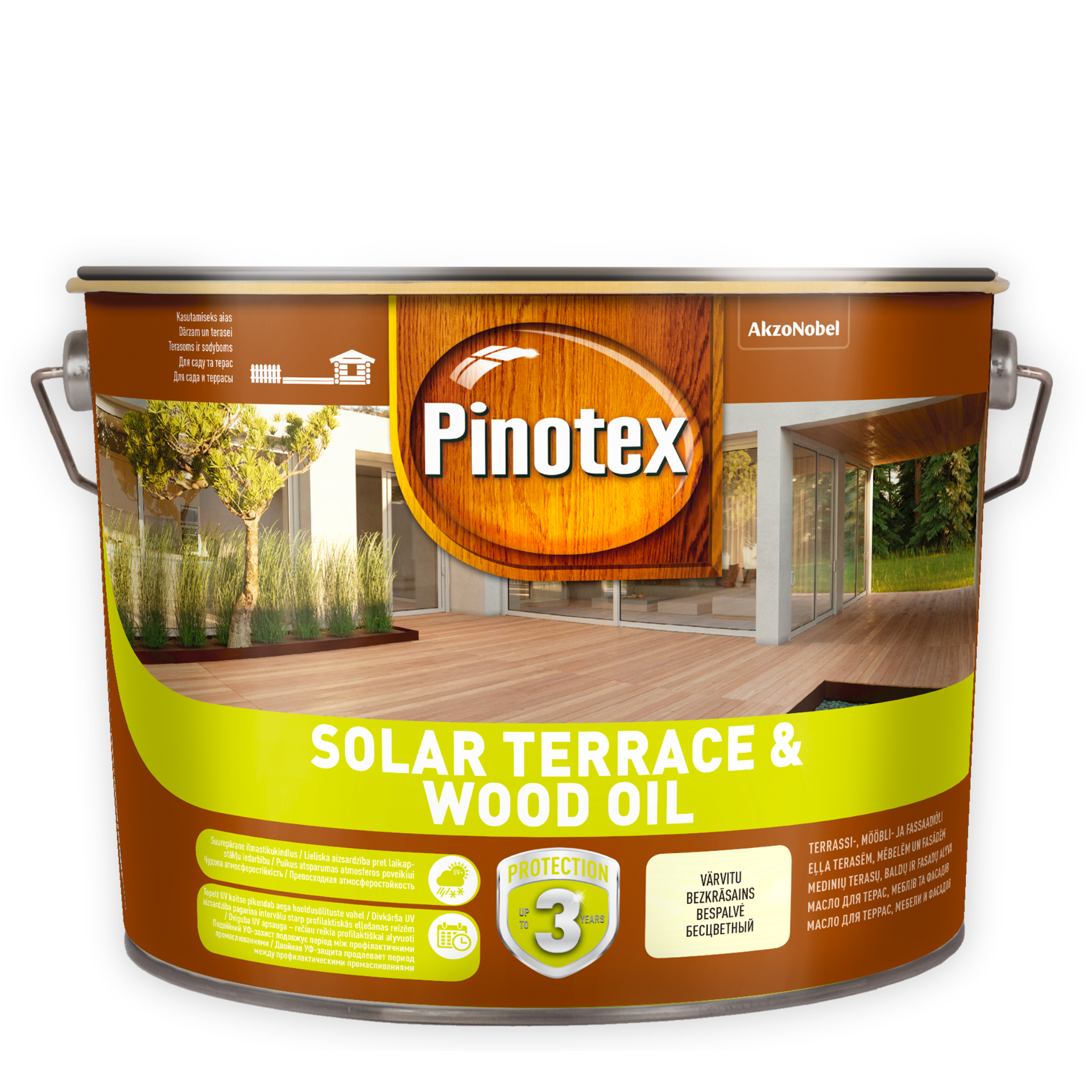Pinotex Solar Terrace & Wood Oil on terrassi-, mööbli- ja fassaadiõli. Suurepärase ilmastikukindlusega veepõhine puidukaitseõli. Õli tungib sügavale puitu ning takistab niiskuse imendumist ja puidu lõhenemist. Tootele lisatud vaha suurendab veelgi õlitatud pinna vee ja mustuse hülgavust. Tänu õlis sisalduvatele, hallituse levikut takistavatele toimeainetele ning UV-kiirguse mõju pärssivale UV-fi ltrile pikeneb periood hooldus õlituste vahel. Toode on mõeldud uute ja eelnevalt puidukaitse krundi või -õliga töödeldud okaspuidust (mänd, kuusk, seeder, lehis), kui ka süvaimmutatud ning kõvematest puidusortidest terrasside, treppide, aiamööbli, piirete, fassaadide sh palkipindade ja teiste välispindade viimistlemiseks