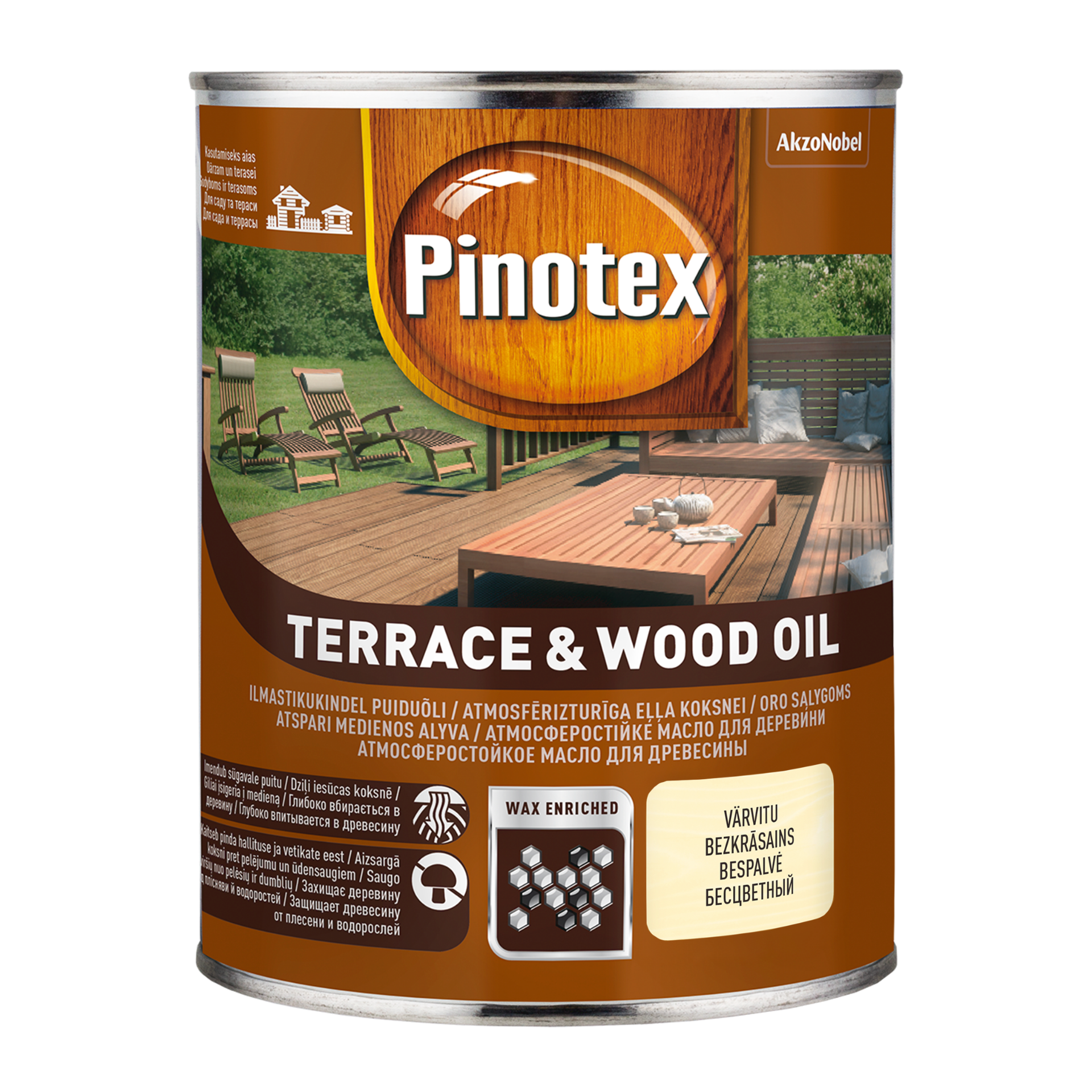 Pinotex Terrace & Wood Oil värvitu on iIlmastikukindel toonitav puiduõli. Hästi imenduv ilmastikukindel puidukaitseõli uute ja varem õlitatud puitpindade dekoratiivviimistluseks ning kaitseks. Toode muudab pinnad vett- ja mustusthülgavaks, parandab nende kulumiskindlust, rõhutab ja säilitab puidu loomulikku tekstuuri. Toode sisaldab toimeaineid hallituse ja vetikate leviku ennetamiseks. Toode on mõeldud uute ja eelnevalt puidukaitsekrundiga või -õlidega töödeldud (mänd, kuusk, seeder, lehis), süvaimmutatud ning kõvematest puidusortidest terrasside, treppide, aiamööbli, piirete ja teiste välispindade viimistlemiseks. Sobib samuti fassaadide ja palkpindade viimistlemiseks