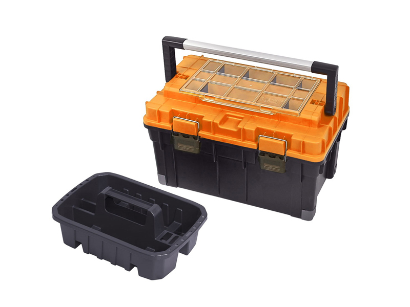 Tööriistakast kahe plast-/metallsulguriga. Tõstetav sahtel on mõeldud rohkem kasutatavate tööriistade jaoks. Sang on metallist. Kasti kaanel on suur laegas osaliselt püsilahtritega tarvikute hoiustamiseks. Kasti mõõdud 59,5x34,5x35,5cm.