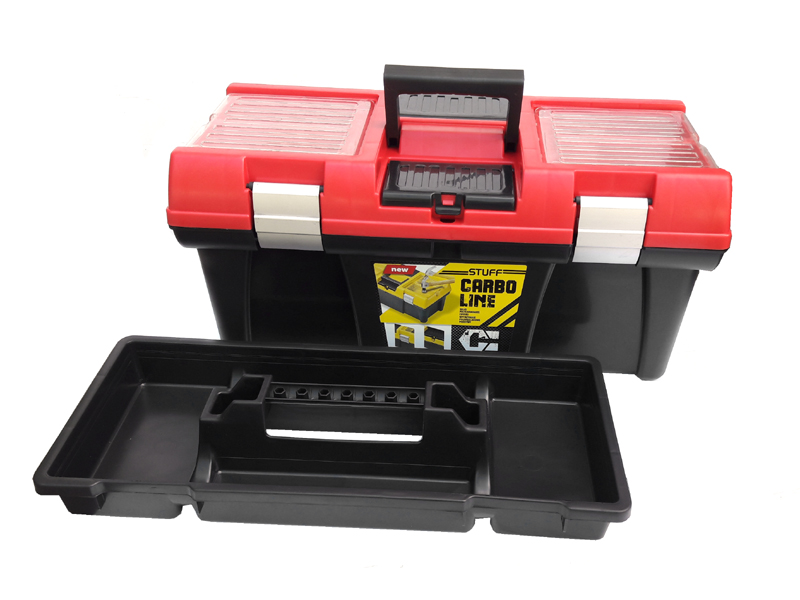 Praktiline ja mahukas tööriistakast STUFF-CARBO. Tõstetav sahtel on mõeldud rohkem kasutatavate tööriistade jaoks. Kast on klambritega suletav ning sellel on ka mugav käepide.