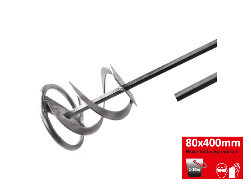 Spiraalvispel Ø80mm, pikkus 400mm. Sobib värvi ja vedelate materjalide segamiseks. Kuuskantotsikuga, kasutamiseks (aku-)/elektritrelliga. Max. 10kg